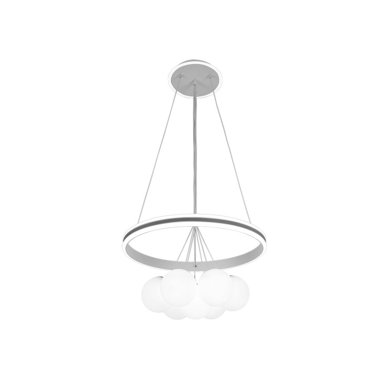 Colgante de la serie RODANO de color BLANCO/GRIS. Este moderno colgante LED está realizado en metal y acrílico. Posee tecnología LED INTEGRADO con 104 watios de potencia, 8320 lúmenes y 3 TEMPERATURAS SELECCIONABLES DE LUZ (3000k, 4000k y 6000k) luz cálida, natural y blanco frío. Viene con MANDO A DISTANCIA incluido y es REGULABLE EN INTENSIDAD. Se caracteriza por su diseño de un aros de luz que abarca a 7 tulipas esféricas blancas resultando un bonito juego lumínico suspendido por cables y muy decorativo, haciéndose el centro de la estancia que ilumina. Sus dimensiones, regulables en altura son de Regx50x50 centímetros