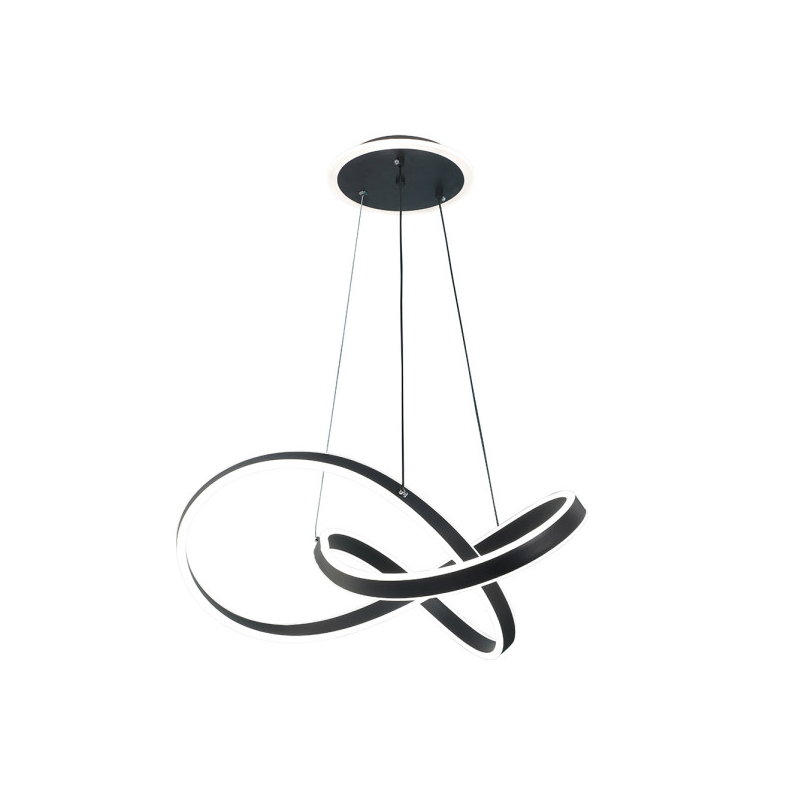 Colgante de la serie NANTES de color NEGRO. Este moderno colgante LED está realizado en metal y acrílico. Posee tecnología LED INTEGRADO con 120 watios de potencia, 9600 lúmenes y con 3 TEMPERATURAS SELECCIONABLES DE LUZ (3000k, 4000k y 6000k) luz cálida, natural y blanco frío. Viene con MANDO A DISTANCIA incluido y REGULABLE EN INTENSIDAD. Se caracteriza por su diseño con formas curvas y entrelazadas con aspecto brillante resultando un juego lumínico muy interesante suspendido por tres cables. Sus dimensiones, regulables en altura son de Regx60x60 centímetros