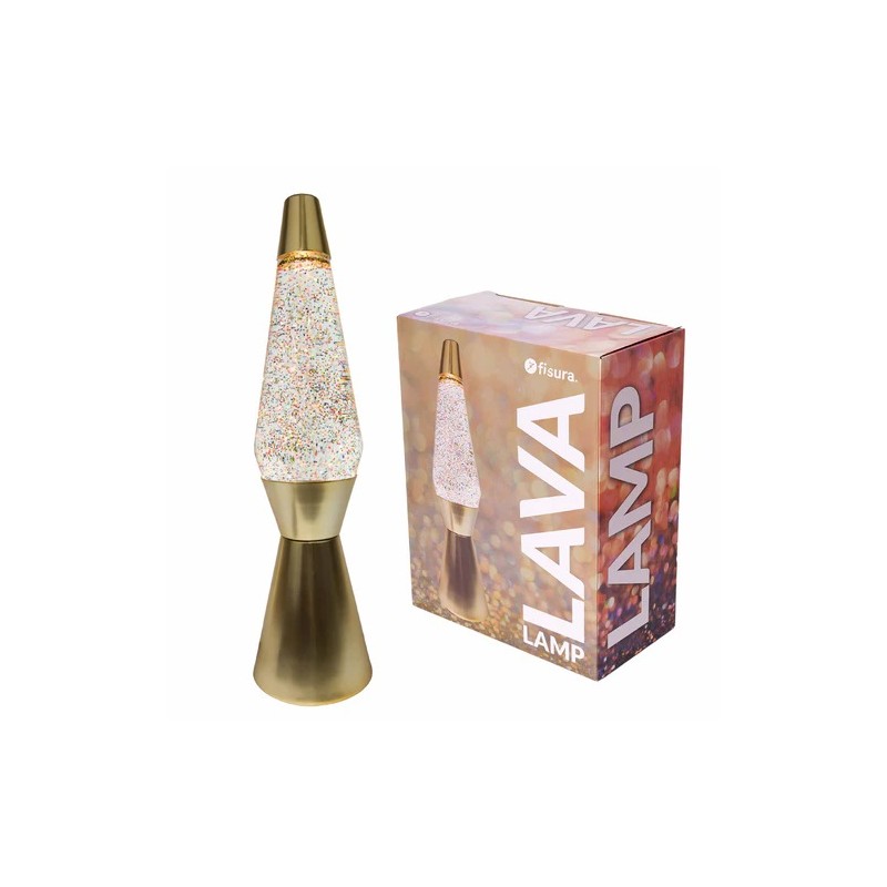 LAMPARA LAVA BULLET CON PURPURINA Y BASE ORO MATE. Relájate con la luz de ambiente de esta lámpara de lava y déjate sorprender con el movimiento de la cera subiendo y bajando. ¡Es el accesorio que necesitas para llenar tu casa de personalidad, magia y color!