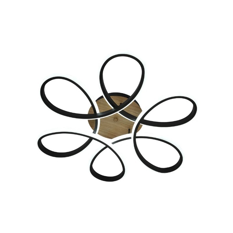 Plafón de la serie BANDEIRA en color NEGRO/MADERA. Realizado en metal, aluminio y acrílico. De diseño futurista muy moderno a la par que elegante, se caracteriza por sus formas curvas y replegadas sobre una pletina en color madera, resultando un original y bonito juego lumínico. Ideal tanto para salas, salones, estancias diáfanas y dormitorios como para espacios de trabajo, dando sensación de profundidad, iluminan con una gran fuente de luz a la vez que decoran la estancia, el diseño de luces que presentan lo hacen el centro de la habitación que iluminan. Posee tecnología LED INTEGRADA, proporcionando un gran ahorro, con una potencia de 130 vatios y 14300 lúmenes, con TRES TEMPERATURAS SELECCIONABLES DE LUZ, 3000-4000-6500ºK (luz cálida, natural y blanco frío) pudiendo elegir en cada momento la que mejor se adapte a la actividad a realizar. Viene con MANDO A DISTANCIA incluido, REGULABLE EN INTENSIDAD y MEMORIA de color. Tiene unas dimensiones de 12x61x61 centímetros.