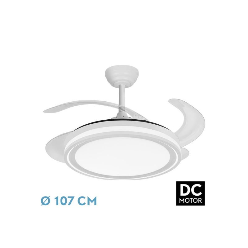 Ventilador DC de la serie BANDIDO realizado en metal, ABS y policarbonato en color BLANO con cuatro aspas DESPLEGABLES transparente muy resistentes. Tiene seis velocidades ajustables. Tecnología LED integrada con una potencia de 59W, con 3 TEMPERATURAS SELECCIONABLES DE LUZ (3500-4000-6500K) y 5900 lúmenes. Control de aire verano o invierno. Su medida es de 35,5/45,5X48 centímetros con las aspas plegadas y de 35,5/45,5X107 centímetros con las aspas desplegadas. Incluye dos tijas de 10 y 20 centímetros, para colocar a distintas alturas. Mando a distancia INCLUIDO y TEMPORIZADOR 1/2/4 H.
