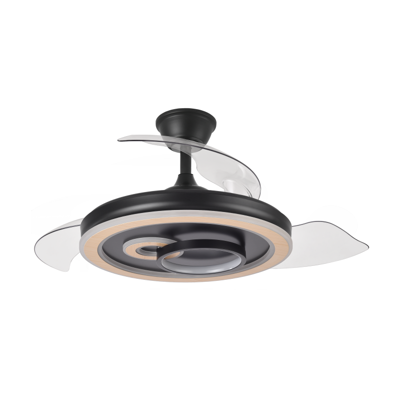 Ventilador DC de la serie SULTAN realizado en metal, policarbonato y ABS, en color NEGRO/MADERA con tres aspas DESPLEGABLES de ABS transparente muy resistentes. Diseño muy moderno y original, con bonito juego de luces. Tiene seis velocidades ajustables. Tecnología LED integrada con una potencia de 68W, con 3 TEMPERATURAS SELECCIONABLES DE LUZ (3000-4500-6500K) y 4960 lúmenes. Control de aire verano o invierno. Su medida es de 32/47X50 centímetros con las aspas plegadas y de 32/47X107 centímetros con las aspas desplegadas. Incluye dos tijas de 10 y 25 centímetros, para colocar a distintas alturas. Mando a distancia INCLUIDO, REGULABLE EN INTENSIDAD, con MEMORIA DE COLOR incorporada y TEMPORIZADOR 2 H. Puede utilizar el control VIA APP : FAN LAMP PRO, desde el que podrá manejar también su ventilador de manera fácil e intuitiva desde su móvil.